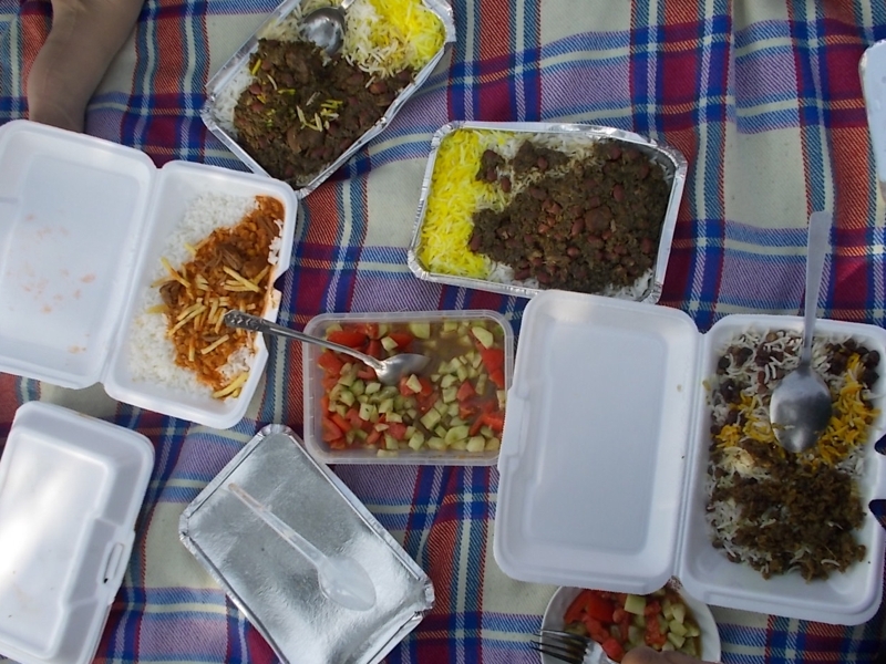 Am Vortag des Ashura-Festes wird auf den Straßen Essen verteilt, Tee, Kakao und Süßigkeiten. Im Bazar drückt man mir ein gerolltes dünnes Brot mit Kartoffelfülle in die Hand. Er sei froh, dass mich das Essen gefunden hat, sagt der Mann sinngemäß, als er merkt, dass ich keine Iranerin bin. Herr Abbasi, seine zwei Nichten und ich essen im Park.