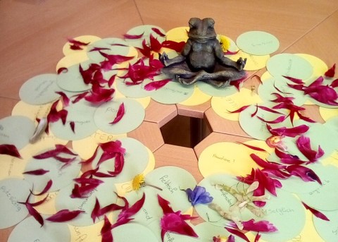 Zurück zum ersten Tag der Schreibwerkstatt. Denn dieser endete nicht nur mit einem Frosch inmitten von Blütenblättern, sondern mit einem lyrischen Experiment. Eine Viertelstunde befühlten und bestaunten wir das Gesammelte, suchten nach Worten und Beschreibungen. Dann bat ich Chiara, Hanna, Julia, Alina und Niclas um ein, zwei Zeilen, um etwas Poesie.