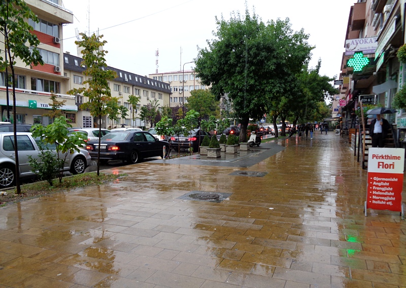 Zurück nach zwei Sonnenhitzetagen, anderen Geschichten, neuen Menschen, stundenlangen Gesprächen. Zurück im Kosovo, es regnet, das Angestrengte lässt sich nicht ausblenden. Der Herbst zieht überall gleich ins Land. In die nasse Stadt. Reife Kastanien unter braungeränderten Blättern. Die Wohnung, der Küchentisch hält mich nicht mehr, ich möchte ins Dit‘ e Nat‘, um diesen Text zu schreiben. Bin angekommen in Prishtina, weil: Schau ich links oder rechts, suche ich nach dem Weg? Nein. Ich schaue vor allem auf den Boden, weil ich mir den Gehsteig nicht nur, wie gewohnt, fallweise mit Bäumen und mutig geparkten Autos teilen muss, sondern mit Pfützen in verschiedensten Größen und Farben.