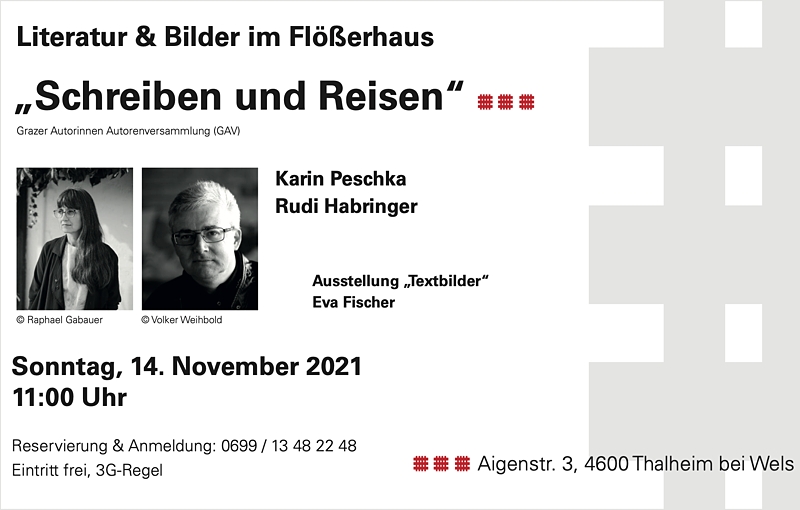 Literatur und Bilder im Flößerhaus – Schreiben und Reisen: Vom 5. bis 14. November 2021 finden Text und Bild in Thalheim bei Wels zusammen. Die Ausstellung Textbilder von Eva Fischer bildet den Rahmen der Reihe, bei der
