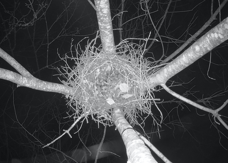 Das strenge Bild der Nachtsichtkamera hebt Naheliegendes ins Weiß. Blätter leuchten vereinzelt, jene, die bei Tag rot/braun sind, am hellsten. Außerdem (außerhalb des Nests gemeint): Deutliches ins Undeutliche geschichtet.