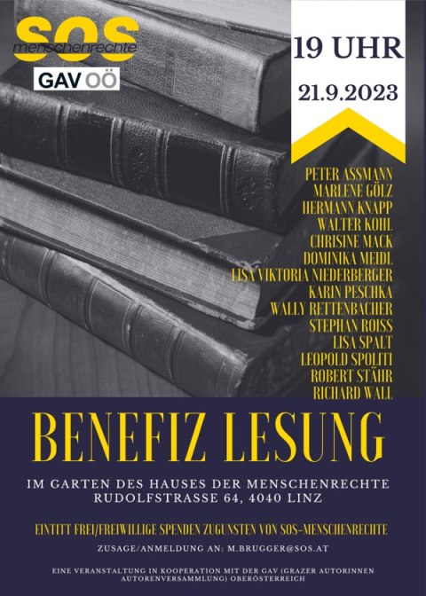 „Am 21.09.2023 um 19 Uhr veranstaltet SOS-Menschenrechte Österreich gemeinsam mit der Grazer Autorinnen Autorenversammlung (GAV) eine Benefizlesung im Garten der Menschenrechte in der Linzer Rudolfstraße 64.