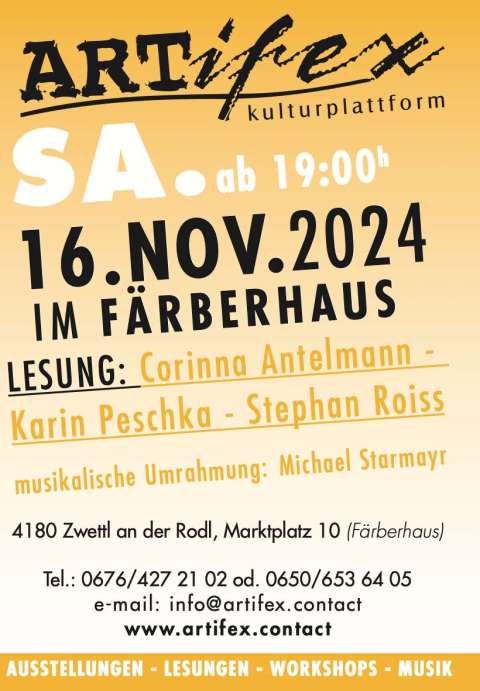 Als nächstes steht eine Veranstaltung der GAV OÖ (Grazer-Autor/innen-Versammlung Oberösterreich) in Kooperation mit der Kulturplattform ARTifex auf dem Programm, am kommenden Samstag in Zwettl an der Rodl: Kollege Walter Kohl hat Stephan Roiss, Corinna Antelmann und mich eingeladen, aus unseren Büchern zu lesen, die Musik kommt von Michael Starmayr.