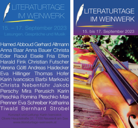 Bei den drei Tage dauernden Literaturtagen im Weinwerk befindet sich der/die Autor*in in besonders guter Gesellschaft, wie der Blick ins Programm verrät. Ich lese zB am Samstag ab 18 Uhr mit den Kollegen Bernhard Strobel und Thomas Hofer, moderiert von Jakob Perschy und Karin Ivancsics und mit Musik von Max Prenner und Harald Fink.